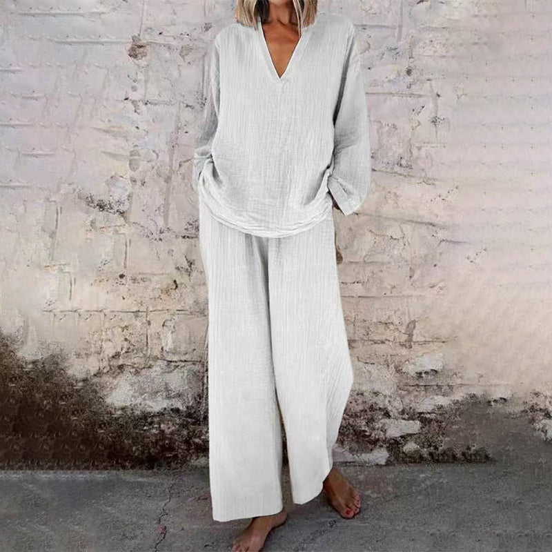 Pachetul include: 1 x bluză cu mânecă lungă și decolteu în V + 1 x pantaloni cu picioare largi